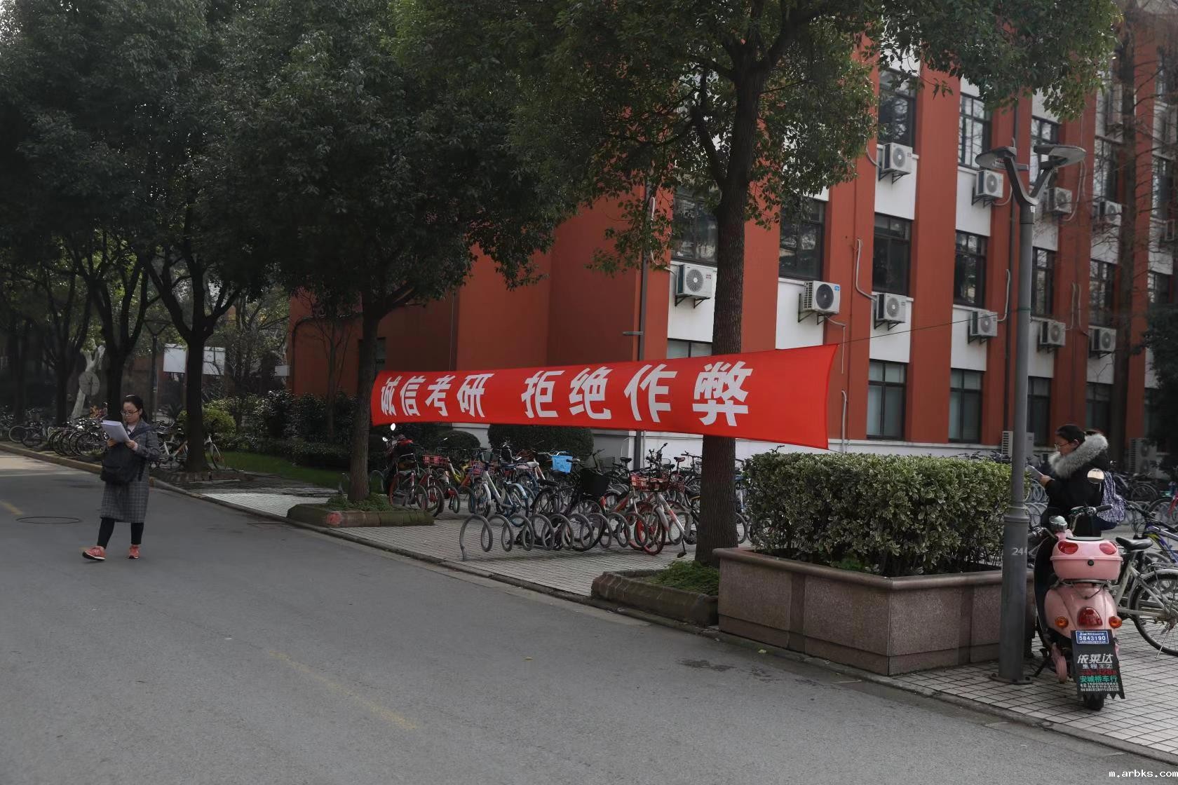 (图:校园内悬挂“诚信考研 拒绝作弊”的横幅)